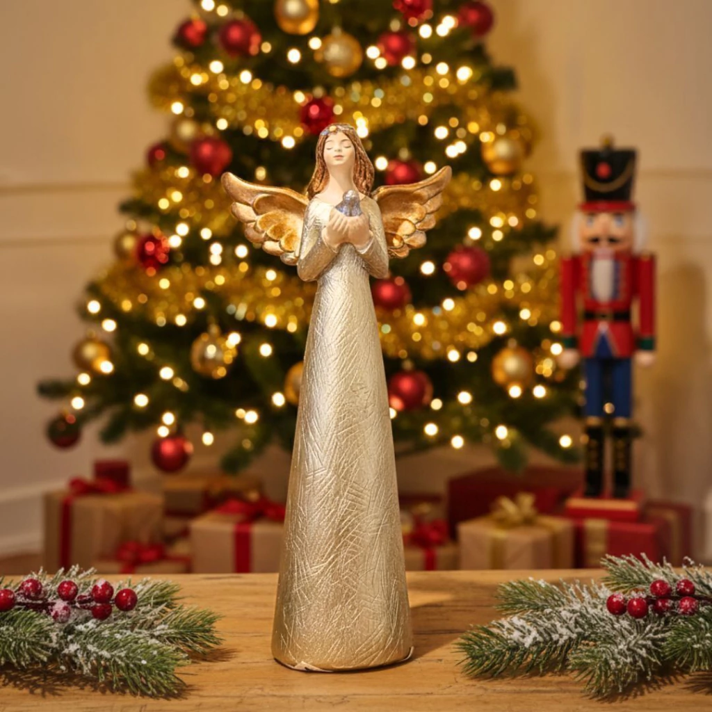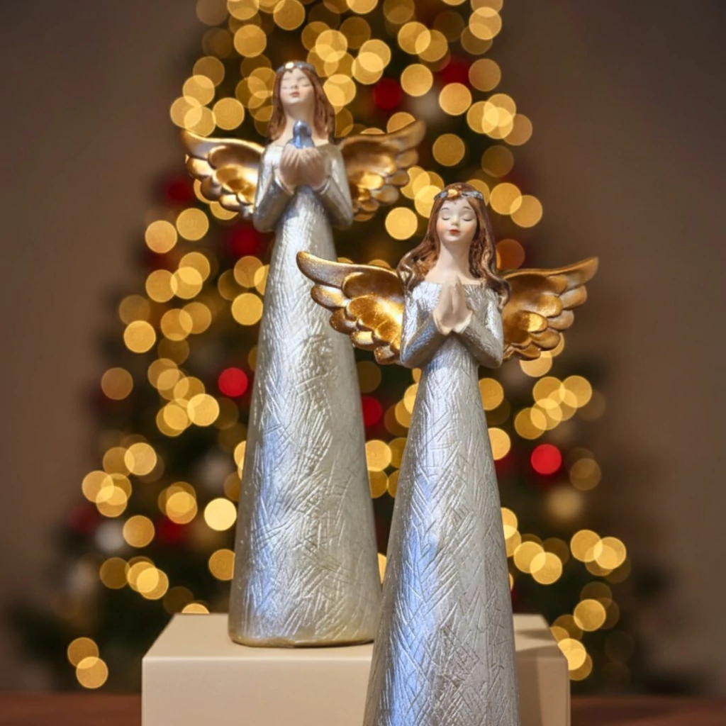 Seja como ponto focal em um canto de oração, adicionando um brilho sutil na sala de estar, ou como parte de sua decoração de Natal, este anjo se adapta com facilidade, trazendo harmonia e um toque angelical ao seu espaço.