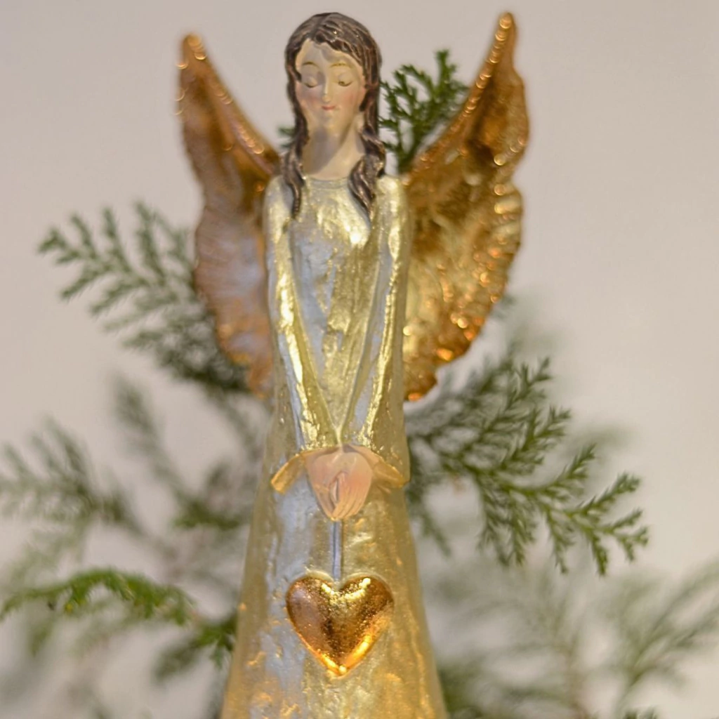 Este encantador anjo natalino de resina segura delicadamente um coração pendurado nas mãos, representando afeto e união. Suas asas detalhadas e o acabamento elegante trazem um toque especial à decoração de fim de ano. Perfeito para enfeitar diferentes cantos da casa e também para presentear com carinho no Natal.
