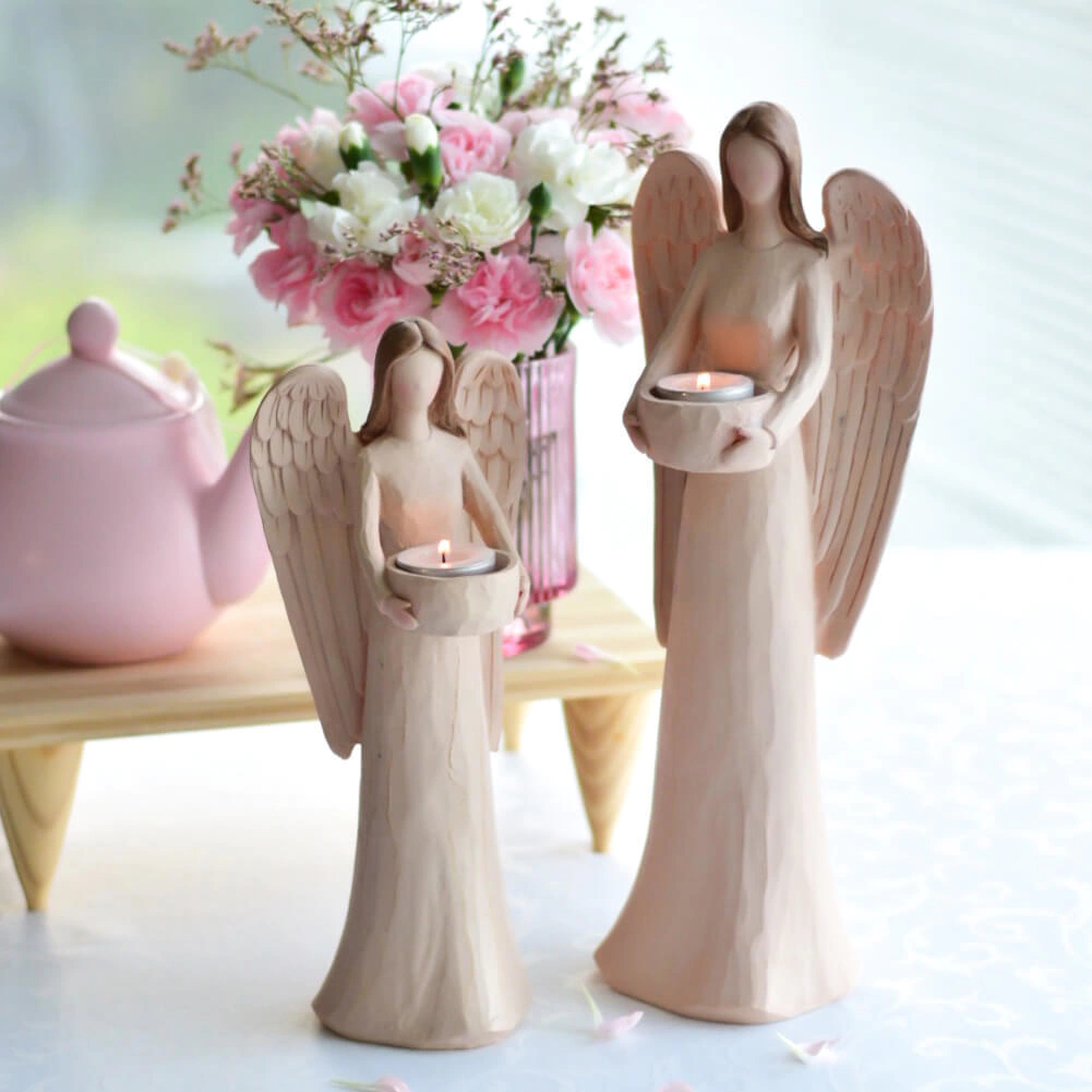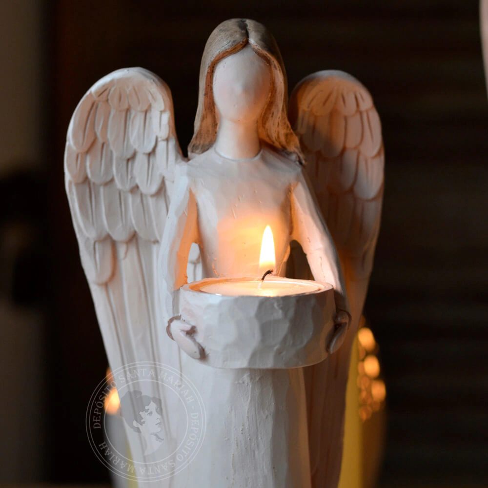 Delicado e muito lindo o anjo porta vela com asas! Uma maneira angelical de levar mais sentimento de paz e luz para dentro de casa, ao mesmo tempo decorando com toque celestial. O anjo é fabricado em resina, uma bela escultura imitando madeira esculpida.