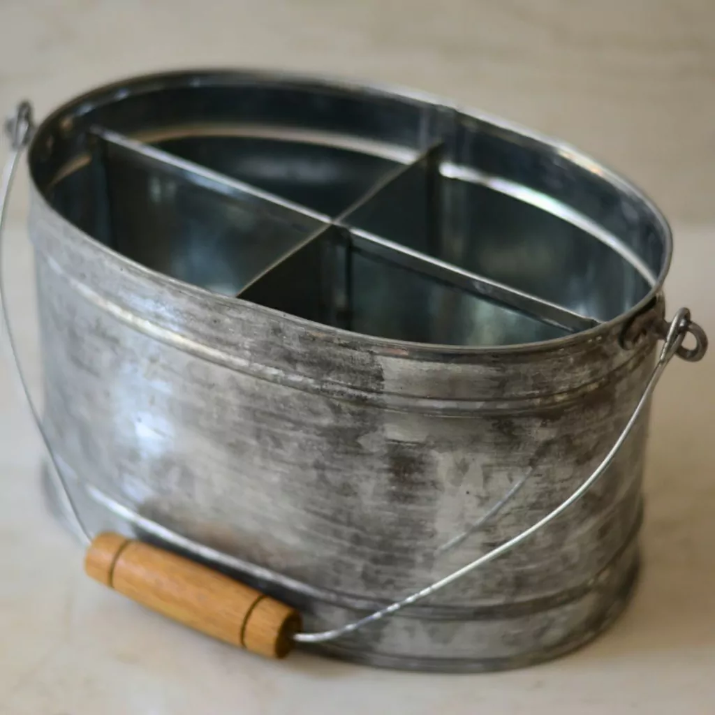 As quatro divisórias internas oferecem uma maneira prática de separar itens, facilitando o uso no dia a dia. Ele é perfeito para armazenar talheres, utensílios de jardim, ou até servir como um charmoso porta-objetos em eventos. A superfície rebitada e a alça ergonômica reforçam seu apelo artesanal e garantem um toque nostálgico e prático.